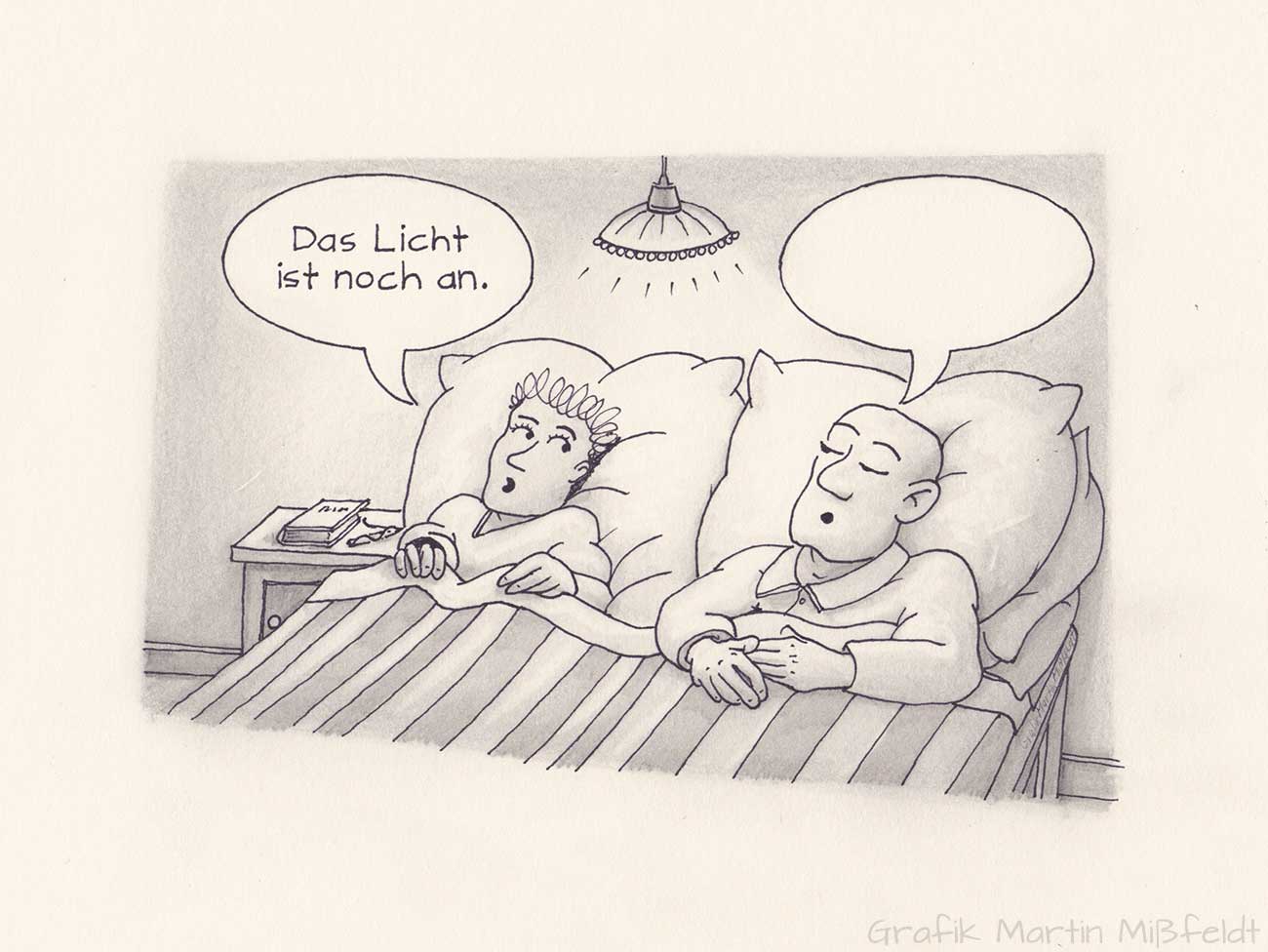 Diese Zeichnung veranschaulicht das Kommunikationsquadrat (Vier-Ohren-Modell) von Friedemann Schulz von Thun. Ein Mann und eine Frau liegen nebeneinander im Ehebett. Während der Mann die Augen bereits fast geschlossen hat, sagt die Frau: "Das Licht ist noch an." Und in der Tat leuchtet oben noch die Lampe des Zimmers. Die Sprechblase des Mannes ist leer. Im Sinne Schulz von Thuns kann man nun überlegen, wie der Mann diesen Satz wohl verstehen könnte - und wie er dann entsprechend antworten würde. Die Grafik eignet sich gut für den Unterricht zum Thema Kommunikation.
