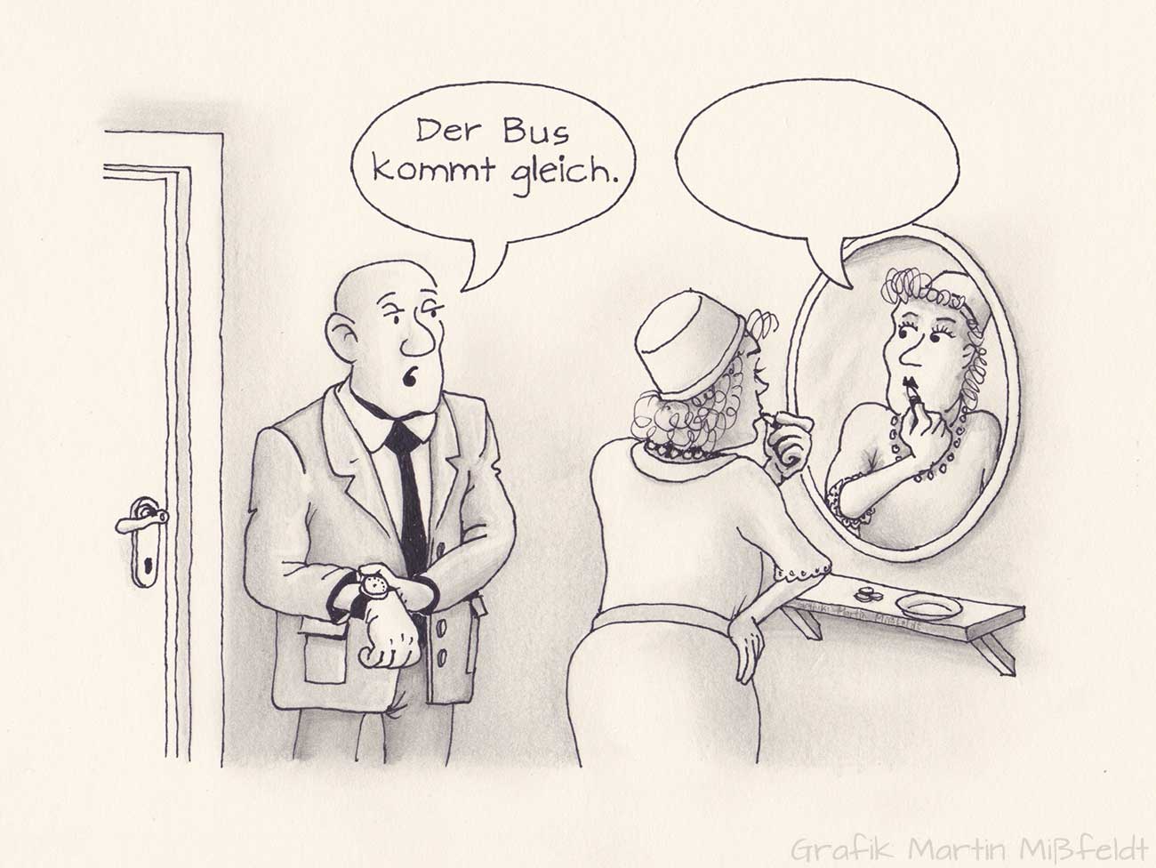 Ein Ehepaar steht an der Wohnungstür. Die Frau schaut in den Spiegel und benutzt Lippenstift. Der Mann zeigt auf seine Armbanduhr und sagt: "Der Bus kommt gleich." Was könnte die Frau daraufhin antworten? Dieses Bild ist ein Beispiel für das Vier-Ohren-Modell (Kommunikationsquadrat) von Friedemann Schulz von Thun. Die Schülerinnen und Schüler können das Bild im Rahmen des Unterrichts analysieren und überlegen, was der Mann wohl meint und wie die Frau es verstehen könnte (siehe Sachinformation, Beziehungsebene, Selbstkundgabe und Appellseite).