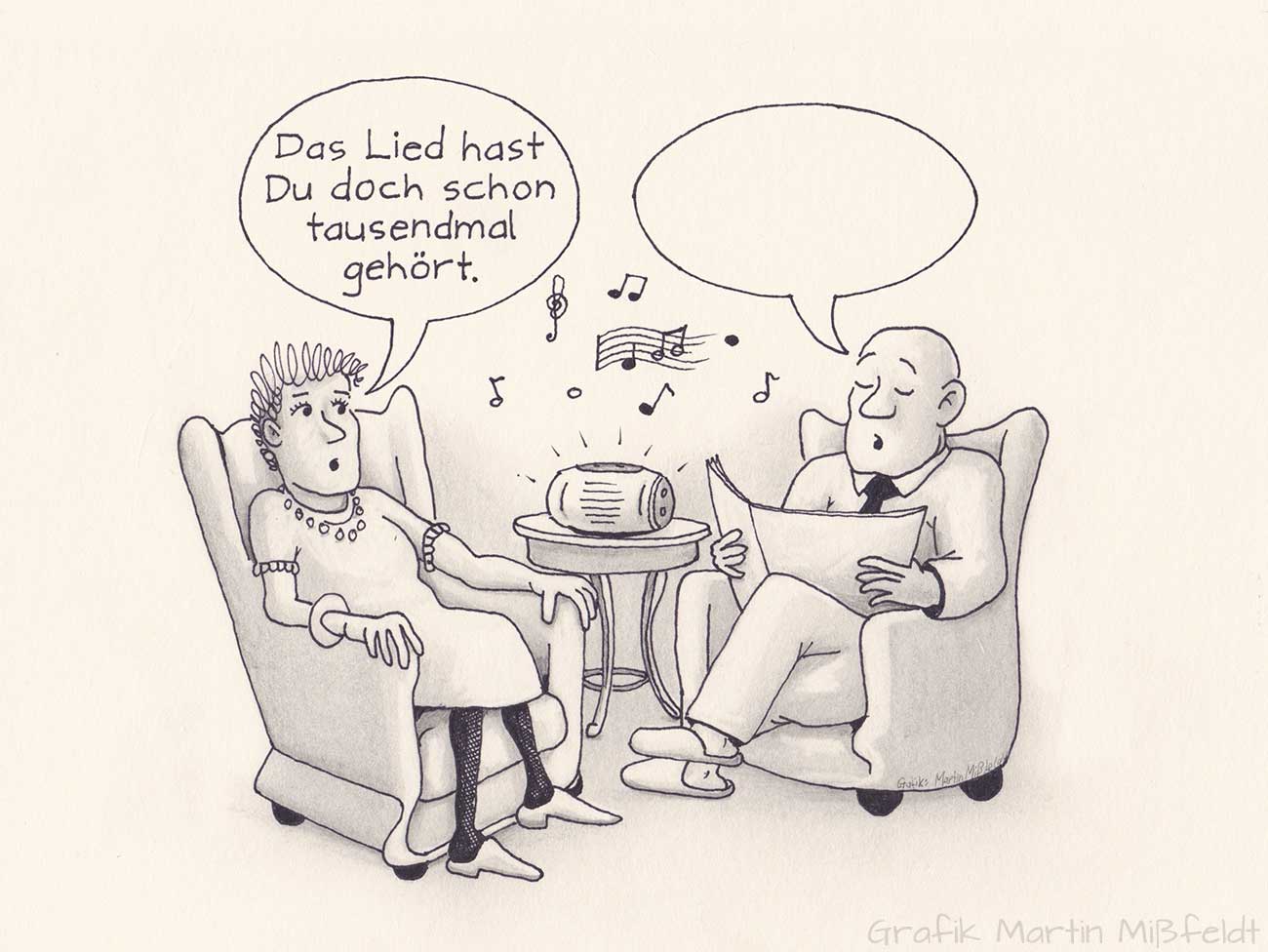 Ein Mann und eine Frau sitzen in Sesseln. Zwischen ihnen steht auf einem Tisch eine Musik-Box, aus der ein Lied ertönt. Der Mann liest in der Zeitung, während die Frau sagt: "Das Lied hast Du doch schon tausendmal gehört." Die Sprechblase des Mannes ist leer - man weiß nciht, was er antwortet. Anhand dieses beispielhaften Bildes sollen die Schülerinnen und Schüler bei mir im Unterricht das Vier-Ohren-Modell von Friedemann Schulz von Thun erarbeiten (Sachinformation, Beziehungsseite, Selbstkundgabe und Appellseite). Wie hat die Frau wohl den Satz gemeint.