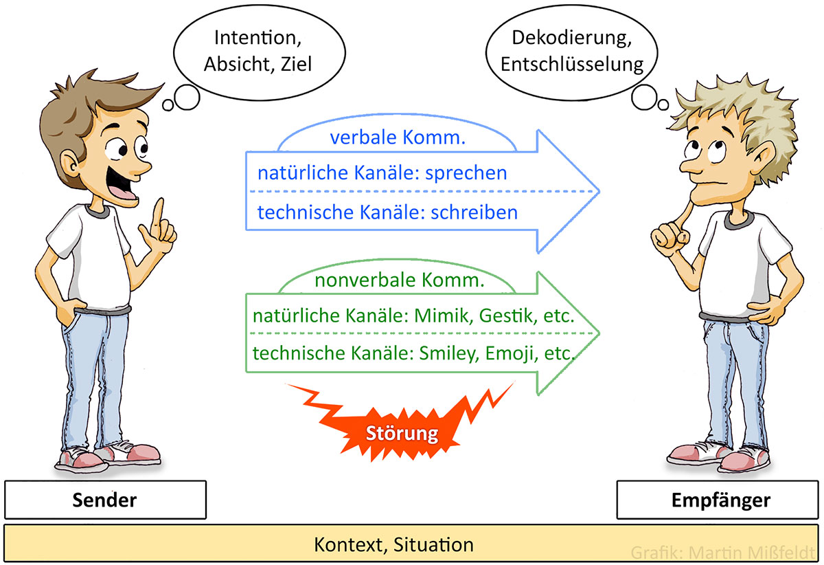 Die Grafik kombieniert das klassische Sender-Empfänger-Modell mit der Unterscheidung zwischen verbaler und non-verbaler Kommunikation. Für beides gibt es prinzipiell zwei Möglichkeiten: entweder wird die Botschaft direkt (face-to-face) übertragen (sog. natürliche Kanäle), oder sie wird mit Hilfe technischer Hilfsmittel übertragen (sog. technische Kanäle). Verbale Kommunikation auf natürlichem Kanal nennt man Sprechen". Verbale Kommunikation mittels technischer Kanäle nannt man schreiben (z.b: Buch, Zeitung, Chat, etc.) Daneben kann man auch nonverbal kommunizieren. Sehr komplex sind die nonverbalen Signale, die man auf natürlichem Wege übermittelt, Dazu gehören u.a. Gestik, Mimik, Körperhaltung, Position zueinander und im Raum, Kleidung, Frisur, etc.