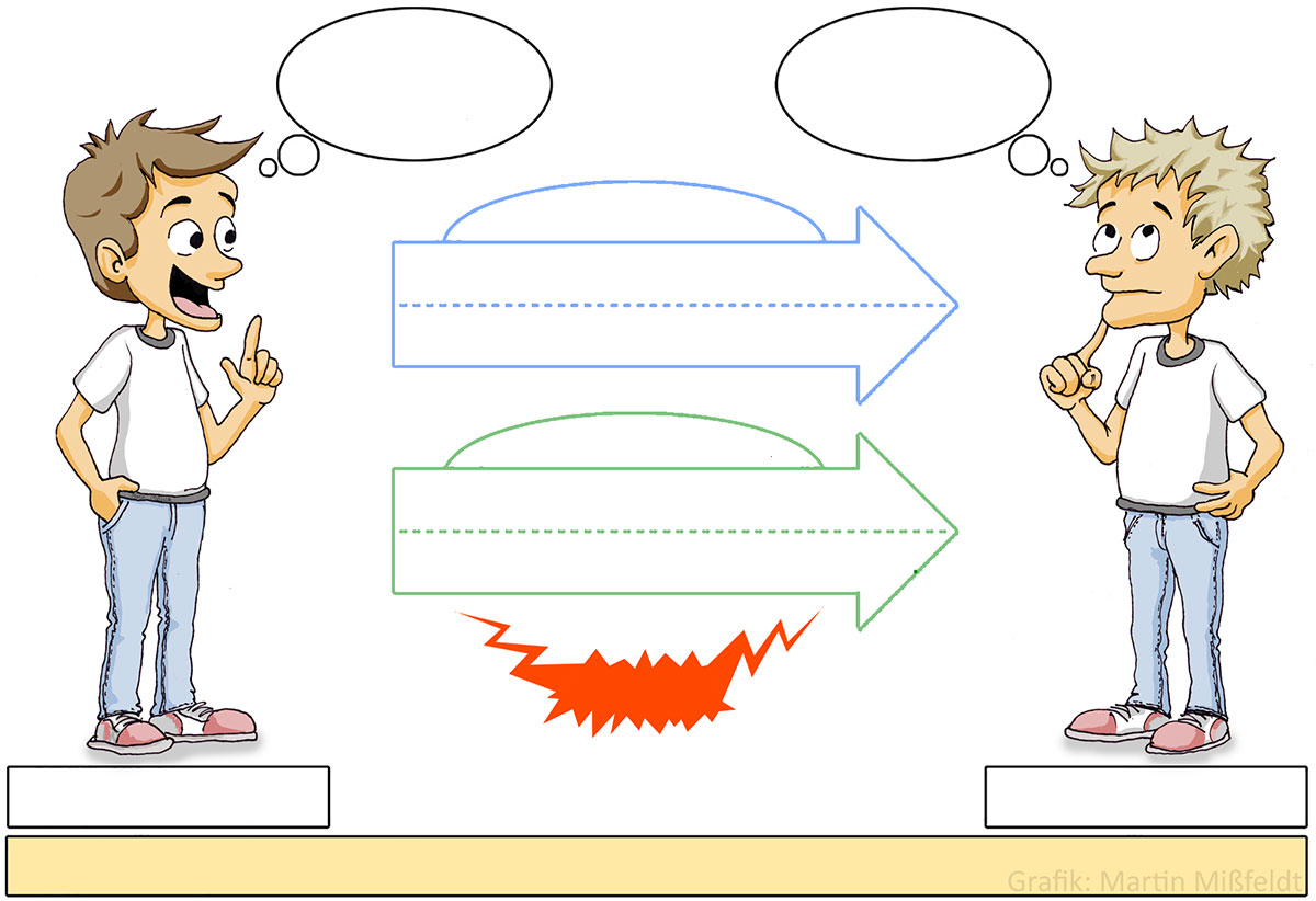 Warum diese Grafik? Ich bin ja seit einiger Zeit Lehrer an einem Gymnasium, und dort unterrichte ich nicht nur Kunst, sondern auch LER (Lebensgestaltung, Ethik und Religion). In der 8. Klasse behandeln wir das Thema Kommunikation - auch um Konflikte bewusster und damit einfacher besprechen zu können. Ich erstelle daher Arbeitsblätter für den Unterricht und genau dafür zeichne ich diese (und andere) Grafiken, die ich dann in meinem Unterricht verwende.